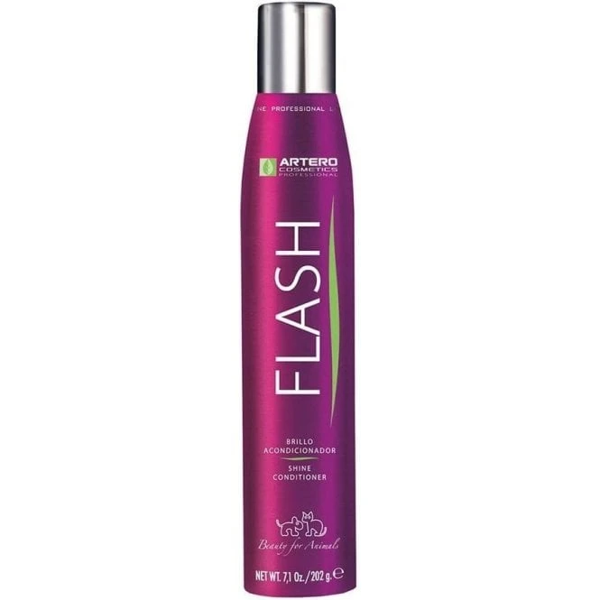 Artero Flash Shine Conditioner Spray gives an extraordinary shine and silky results to all coats. The careful selection of it’s components gives a non-greasy, conditioning effect which allows it’s use as a softner on a dry coat, giving it a shiny invisible film that prevents tangling and helps brushing.