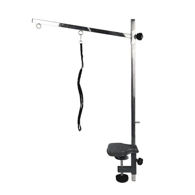 Do you have a lot of fidgety dogs? This adjustable arm is ideal for tethering dogs at the grooming table, making your work less difficult. The arm simply screws on to your grooming table, and features a wide clamp to ensure it is fitted securely to the table. The arm is also height adjustable and extends out to a height of 80cm and a length of 50cm across the table. Comes with 1 noose, two rings for nooses and one on the upright.