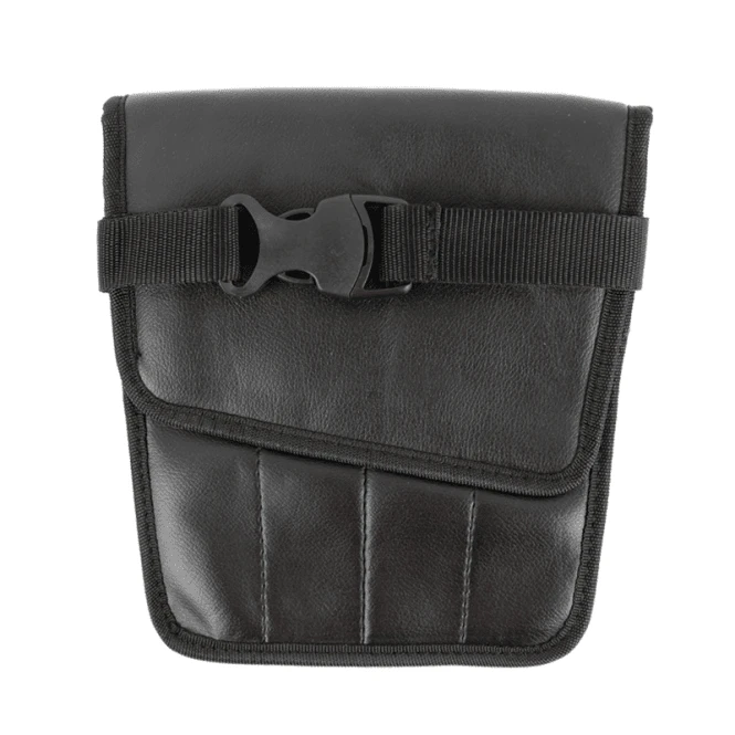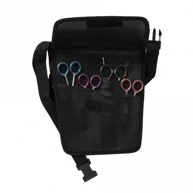 The Large Scissor Holster offers a simple way to store scissors close to hand while grooming. This leatherette pouch holds eight scissors in four individual pockets and two double pockets, and includes a quick-release adjustable strap. The holster features a closing flap that secures with Velcro.